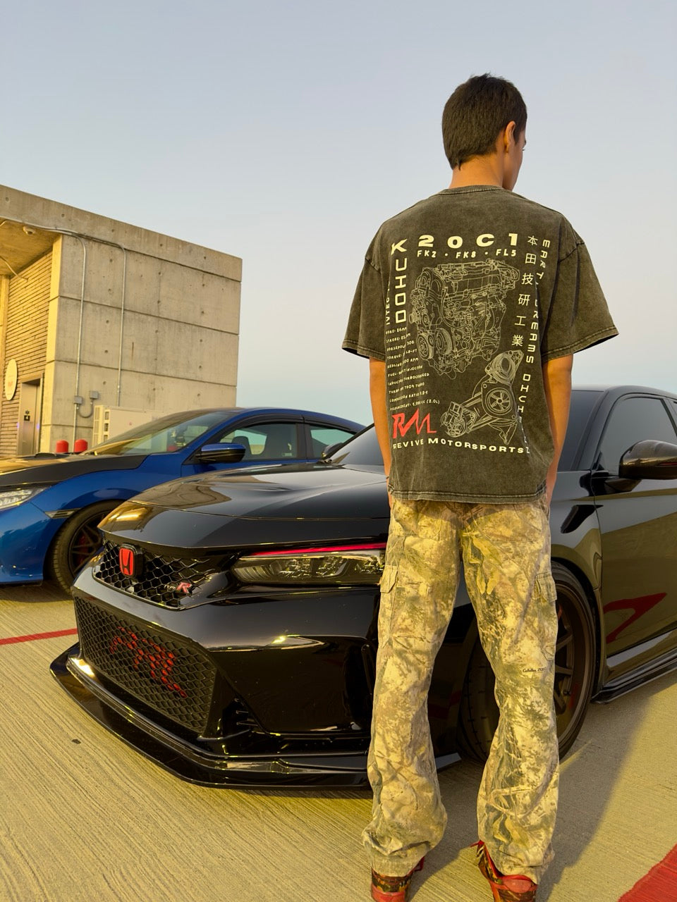 Crafted from premium 100% snow-washed cotton, this oversized tee combines a vintage feel with modern automotive passion. The front features the minimalist RM logo, while the back showcases a detailed technical illustration of the Honda K20C1 engine, paying tribute to the powerplant found in the FK2, FK8, and FL5 Civic Type R.